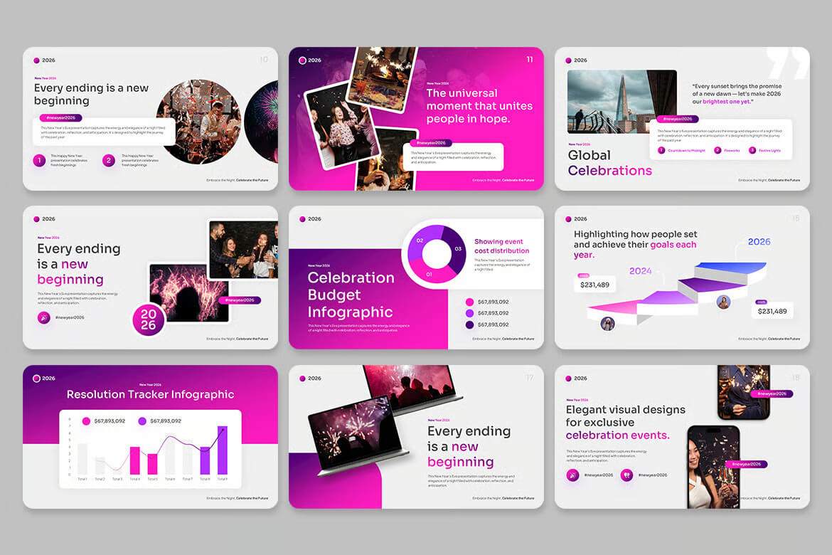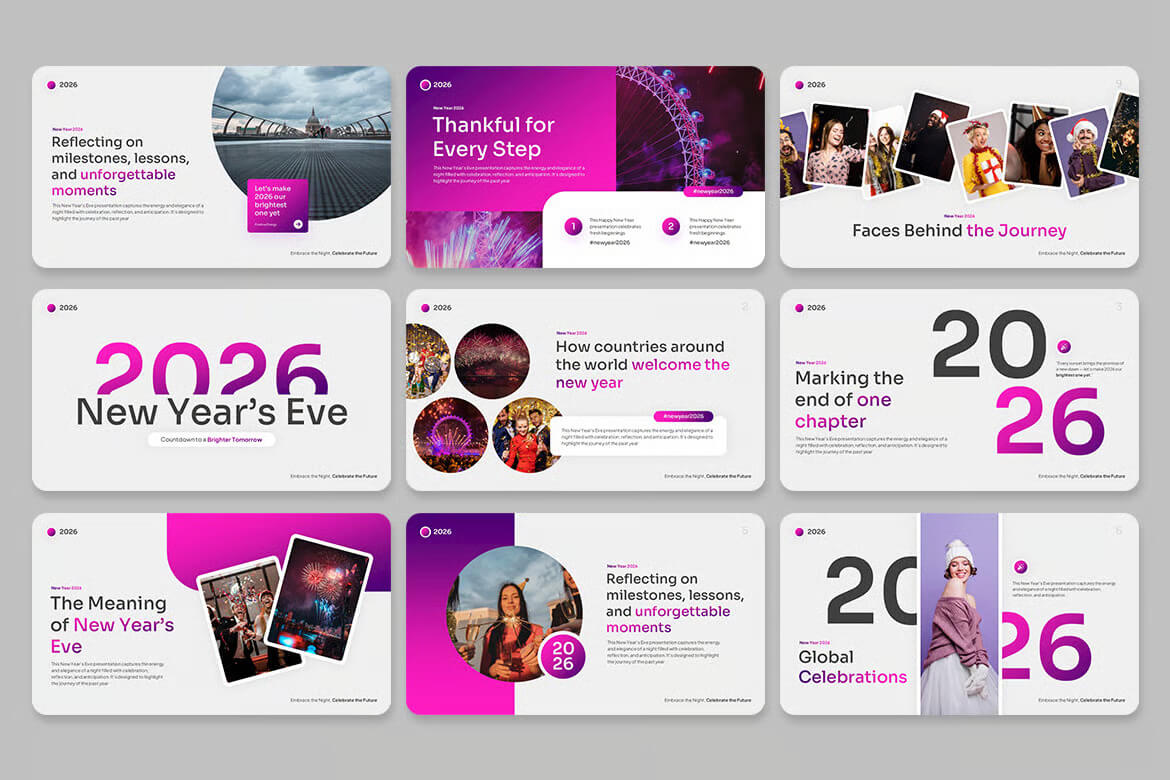 用这款精心设计的演示模板,为新年增添璀璨光彩。这款新年夜演示模板现代、优雅、精致,专为希望以时尚专业的态度迎接新年的创作者、活动策划者、企业和设计师量身打造。