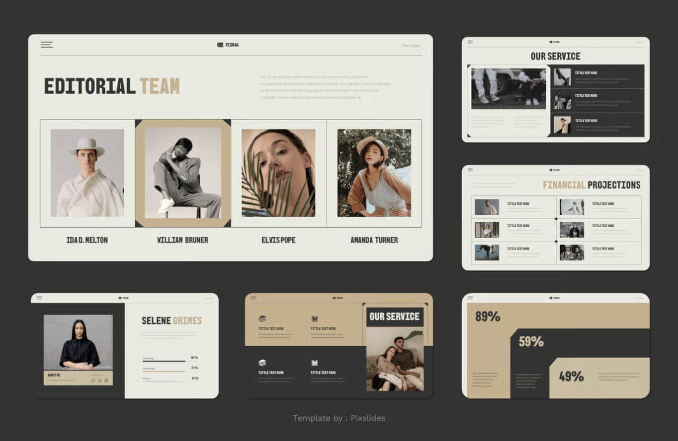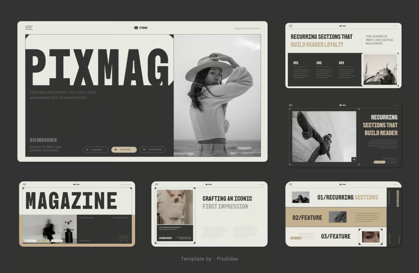 Pixmag - 杂志演示模板。每张幻灯片都独具特色,而非重复设计。只需使用 Keynote,即可为您的品牌打造令人惊艳的演示文稿。它非常适合用于数字媒体资料包、营销资料包或您的其他用途……
