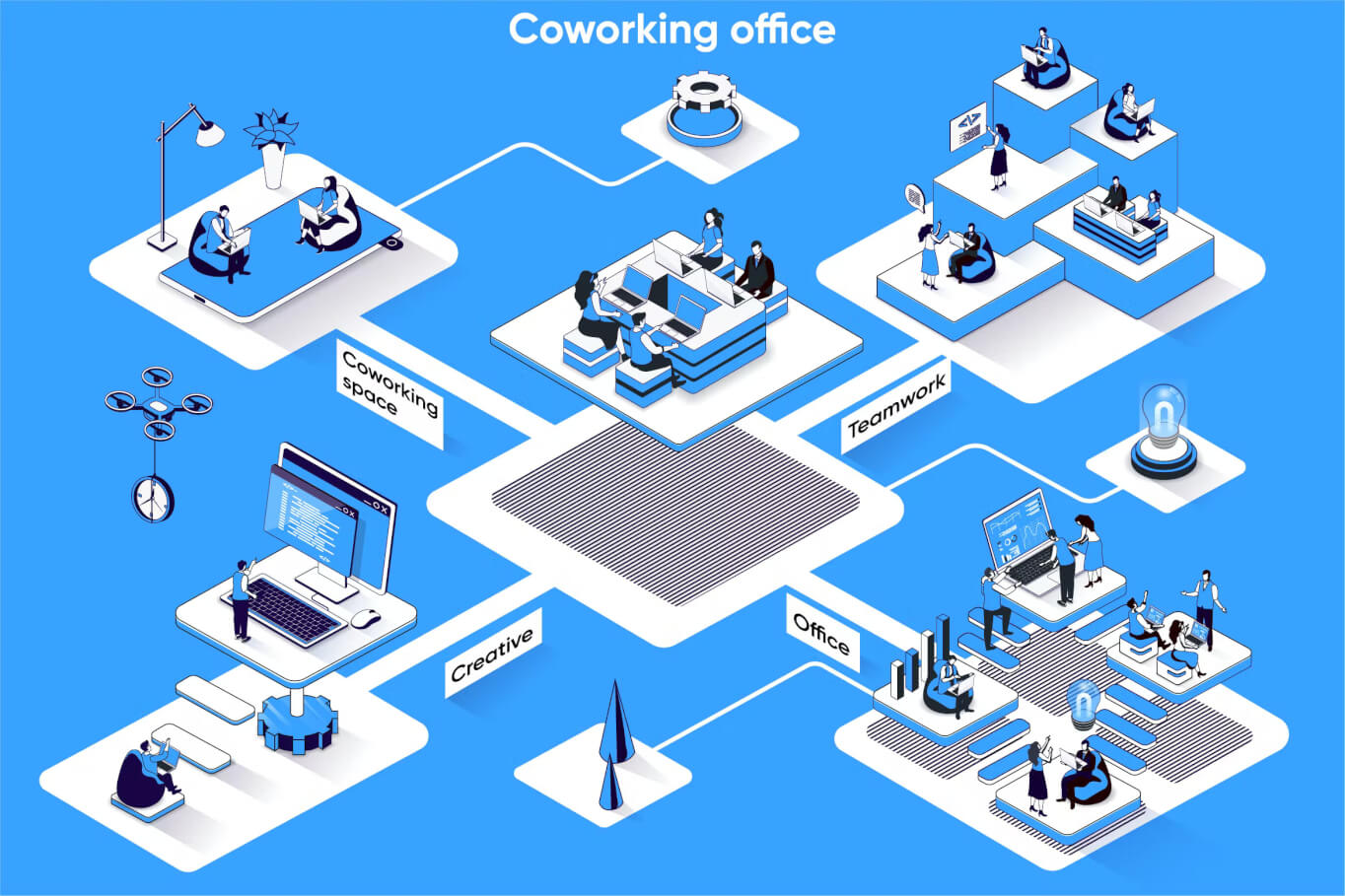 Coworking 办公室等距网络横幅。商务会议和创意团队平面等距概念。开放工作场所 3d 场景设计的同事。矢量图和小人物。