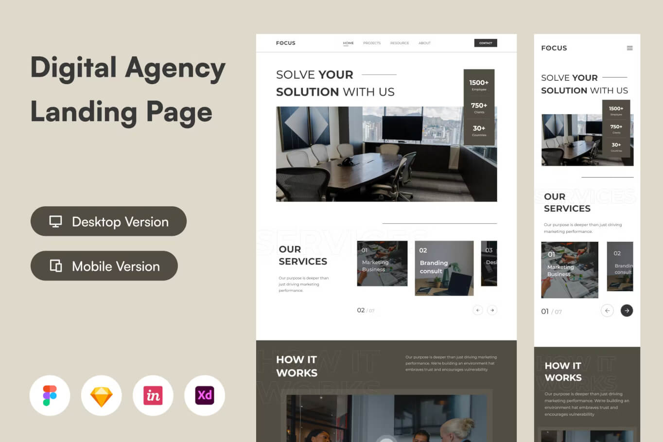 Digital Agency - 完美、清新、时尚的 UI 套件,用于构建漂亮的网站。这些组件基于矢量、完全兼容、可编辑且像素完美。此外,它们组织良好、命名仔细且分组。使用的字体是谷歌免费字体。