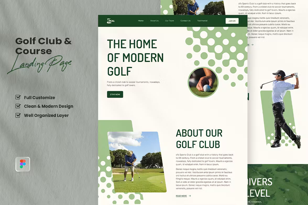 1 个高尔夫俱乐部网站的登陆页面设计。这个概念很容易编辑、定制和调整大小,布局合理,并且充满爱心。