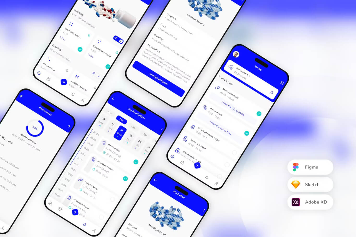 通过我们的 Medicine Reminder 移动应用程序 UI 套件,让用户能够优先考虑自己的健康。